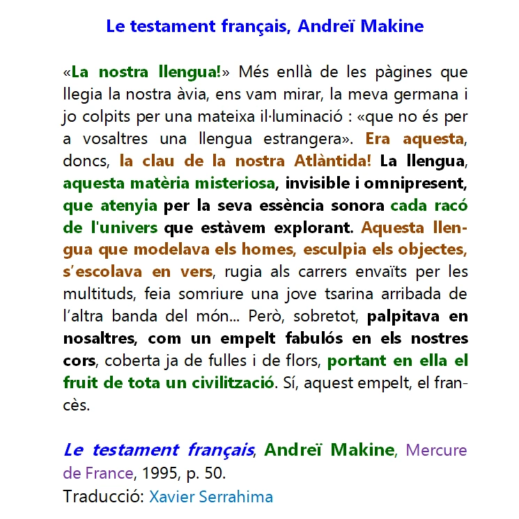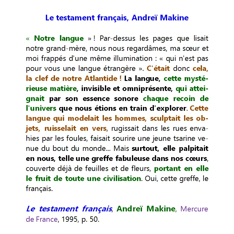« Notre langue » ! Par-dessus les pages que lisait notre grand-mère, nous nous regardâmes, ma sœur et moi frappés d’une même illumination : « qui n’est pas pour vous une langue étrangère ». C’était donc cela, la clef de notre Atlantide ! La langue, cette mystérieuse matière, invisible et omniprésente, qui atteignait par son essence sonore chaque recoin de l’univers que nous étions en train d’explorer. Cette langue qui modelait les hommes, sculptait les objets, ruisselait en vers, rugissait dans les rues envahies par les foules, faisait sourire une jeune tsarine venue du bout du monde… Mais surtout, elle palpitait en nous, telle une greffe fabuleuse dans nos cœurs, couverte déjà de feuilles et de fleurs, portant en elle le fruit de toute une civilisation. Oui, cette greffe, le français.
